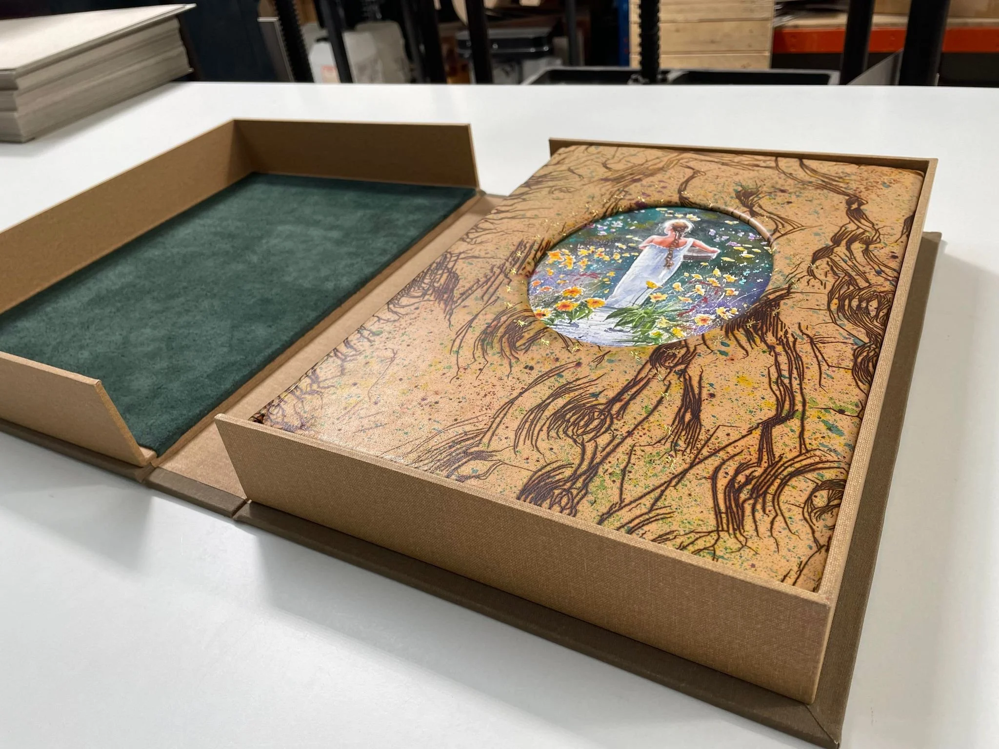 Title and author details across the spine were blocked with dark green pigment foil. The front picture was painted in watercolour. The book was decorated with a variety of foils and hand-sew endbands, and topped off with endpapers featuring suede leather.